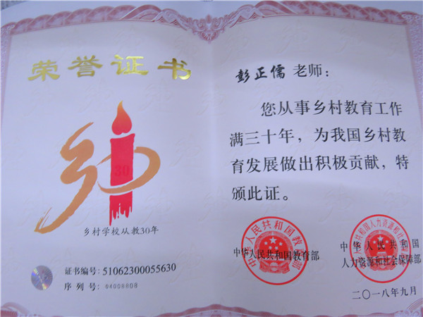 “此次国家教育部、人力资和社会保障部联合颁发的乡村学校从教30年教师荣誉证书,对我们这些扎根乡村的广大中青年教师是一个极大的鼓舞,让我们更加充满了信心,更加坚定了终身从教的决心。”中江县双龙中学肖永兴老师说,他扎根在乡村近30年了,多次上调进城的机会都被他婉拒了。